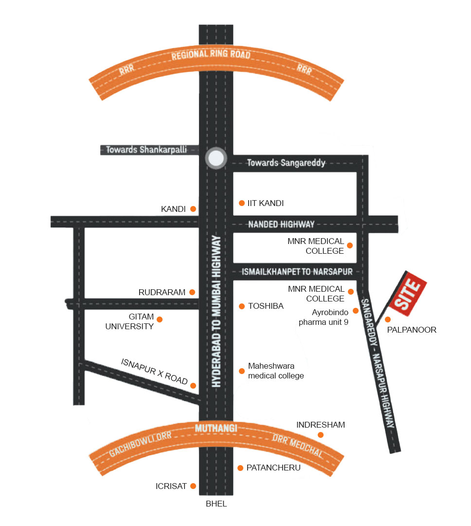 ◉ 10 Min – Mumbai Highway (NH 65) ◉ 10 Min – MNR Medical College ◉ 10 Min – Nanded Highway (NH 16) ◉ 15 Min – IIT Hyderabad ◉ 15 Min – Toshiba Manufacturing Unit ◉ 15 Min – Gitam University ◉ 20 Min – Sangareddy Collectorate Office ◉ 20 Min – ORR (Outer Ring Road) ◉ 25 Min – MNR Group of Institutions ◉ 30 Min – Medical Device Park ◉ 30 Min – BHEL Patancheru ◉ 40 Min – Financial District